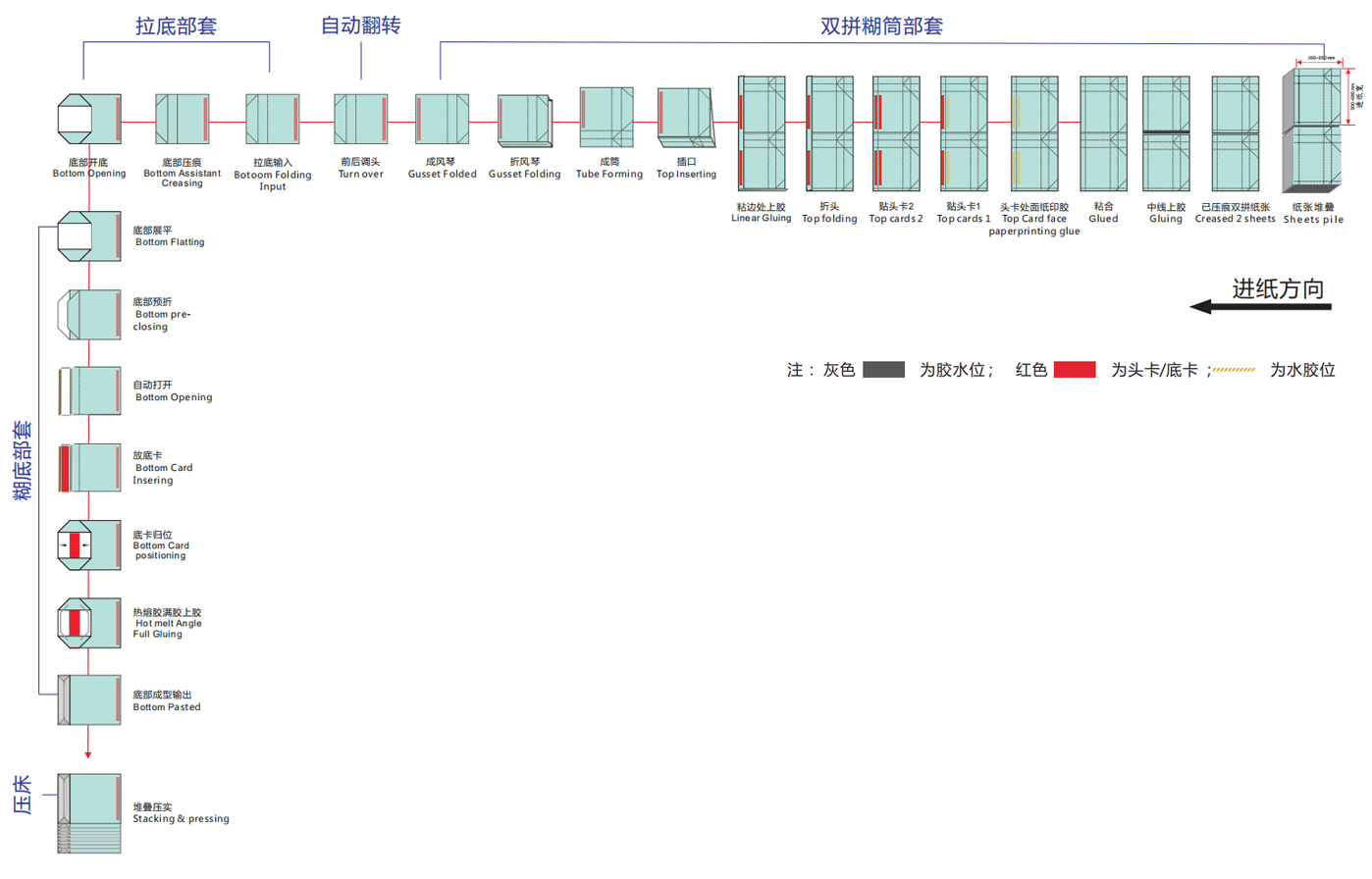 经过特殊的机械结构和电气配合,一次性完成纸袋成型,纸张上胶、粘合、折袋口, 糊筒,折底,放底卡, 底部上胶封合等工艺;改变了以往大纸袋需手工加工制作;